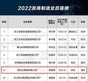 美欣達(dá)榮登2022浙商制造業(yè)百?gòu)?qiáng)榜單